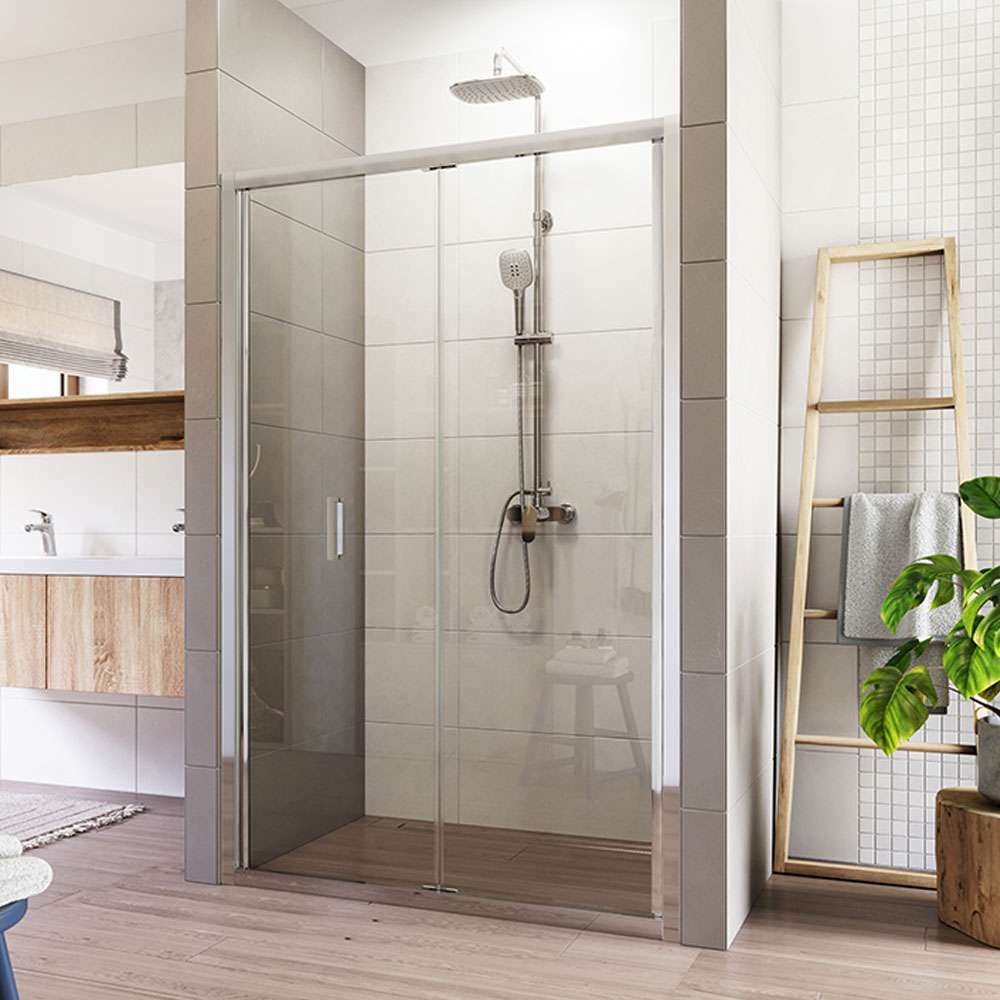 Hliníkové profily v barvě chrom, dveře zalamovací, sklo Čiré, síla skla 6 mm, rozměr 800 mm, výška 1900 mm.