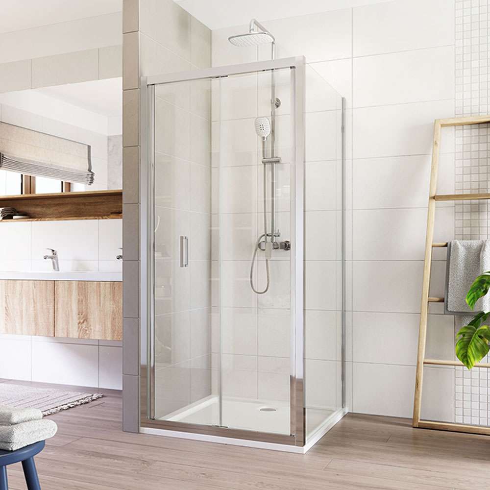 Hliníkové profily v barvě chrom, zalamovací dveře a pevný díl, sklo čiré, síla skla 6 mm, čtverec, 800 (dveře) x 800 (pevný díl), výška 1900 mm.
