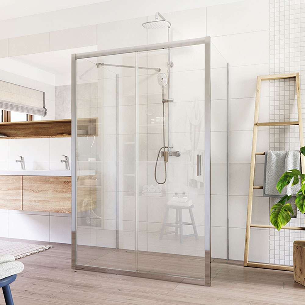 Hliníkové profily v barvě chrom, zasunovací dveře a dva pevné díly, sklo Čiré, síla skla 6 mm, obdélník, rozměr 900x1100x900 mm, výška 1900 mm.