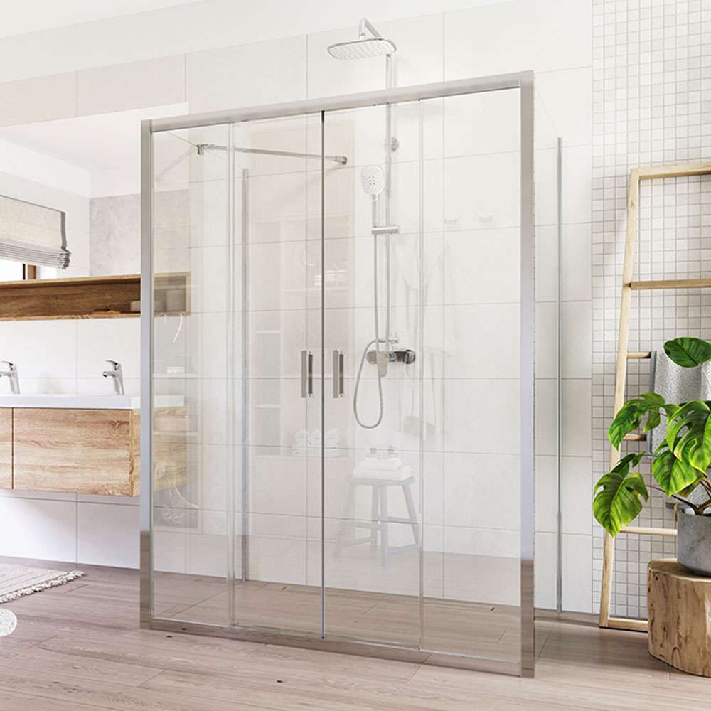 Hliníkové profily v barvě chrom, zasunovací dveře a dva pevné díly, sklo Čiré, síla skla 6 mm, obdélník, rozměr 900x1400x900 mm, výška 1900 mm.